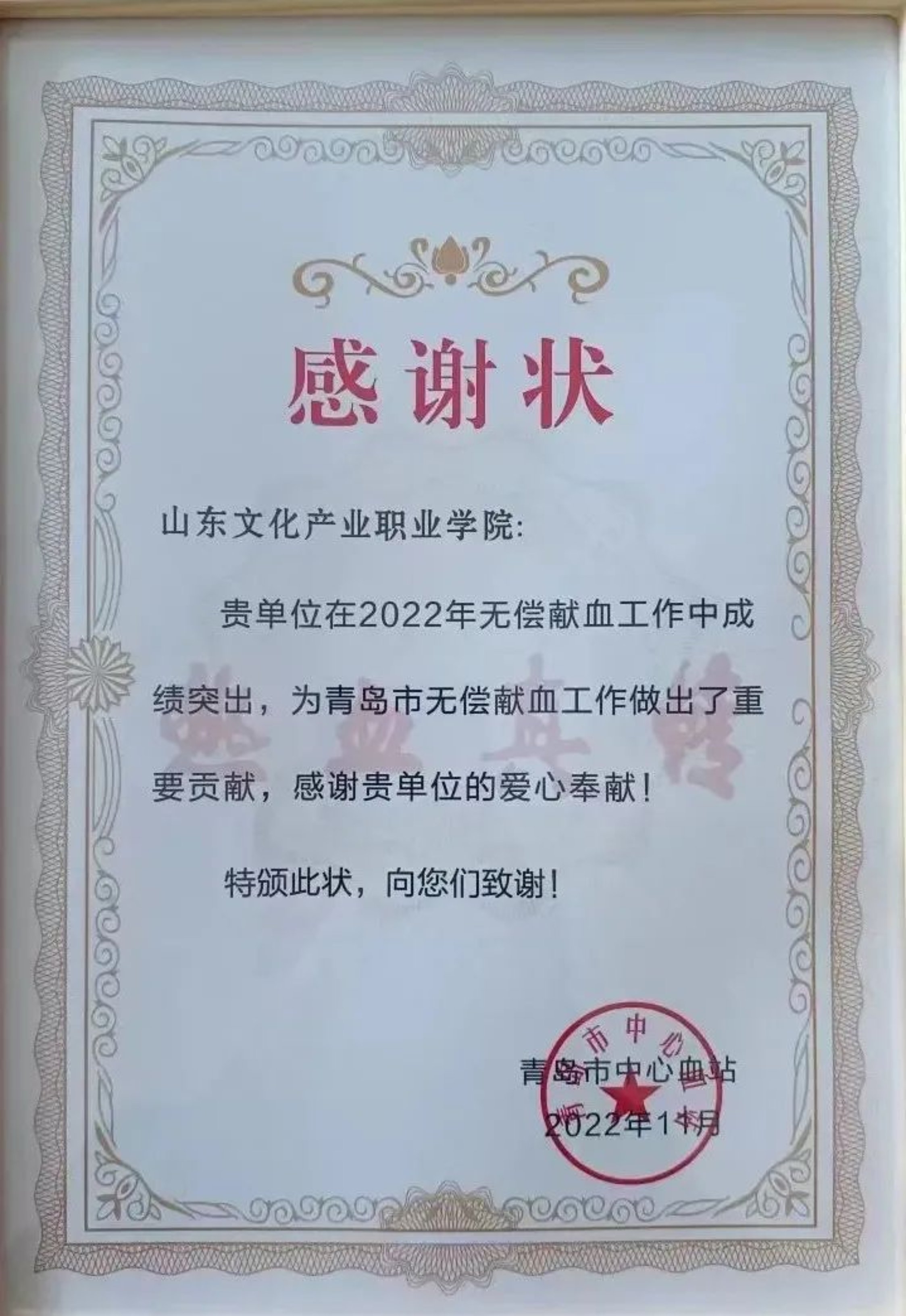 11月15日上午,必威betway西汉姆收到来自青岛市中心血站的感谢状,感谢必威betway西汉姆师生积极参与2022年无偿献血公益活动,为无偿献血事业做出贡献。