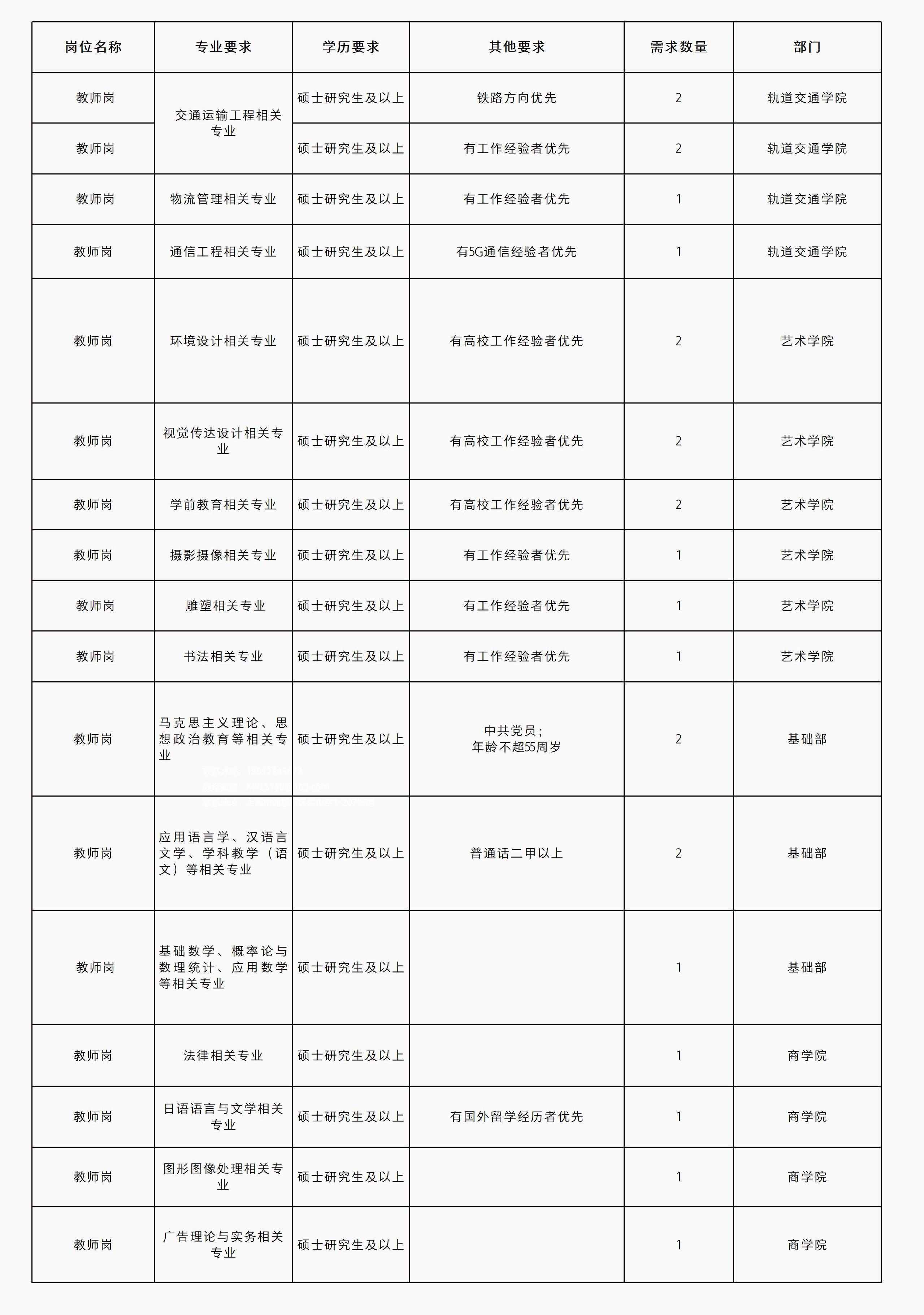 4.面试形式:专任教师主要采取试讲(模拟教学)和答辩(专业技能测试)的方式,主要通过表达能力、教学方法、教学组织等方面测评应聘人员是否具备教师岗位的基本素质和基本技能;其他岗位采取答辩方式,主要考察综合素质和岗位相关的知识与能力。