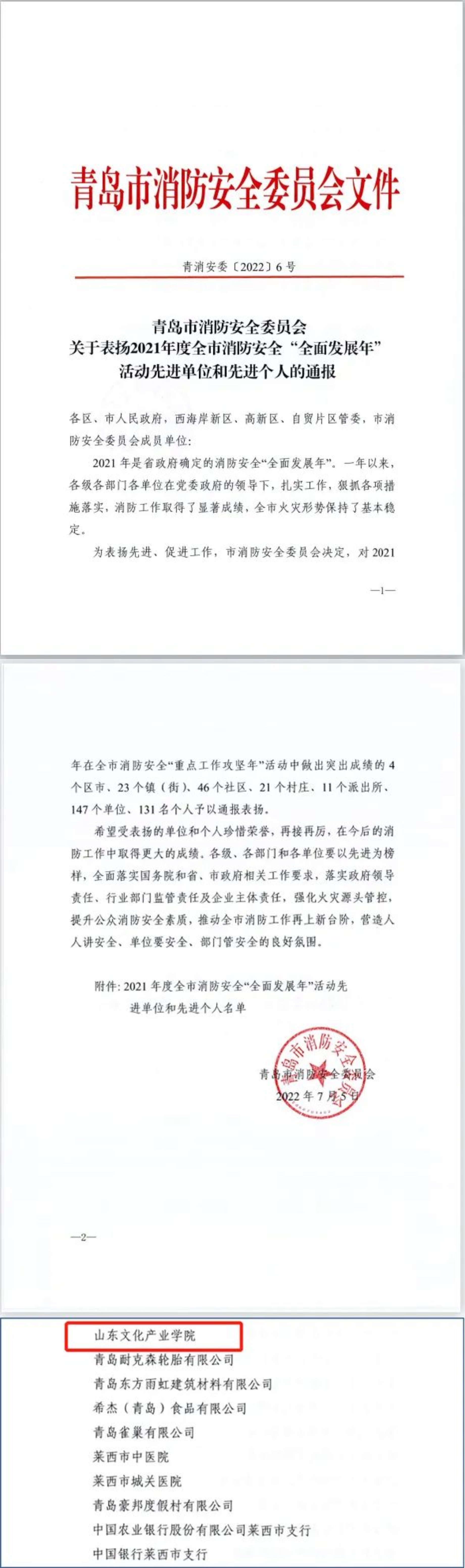 7月5日,青岛市消防安全委员会印发《关于表扬2021年度全市消防安全“全面发展年”活动先进单位和先进个人的通报》(青消安委[2022]6号),必威betway西汉姆被评为先进单位。
