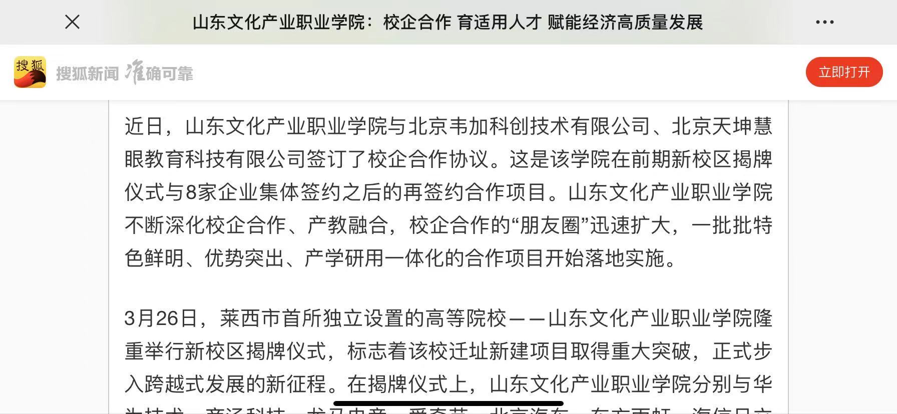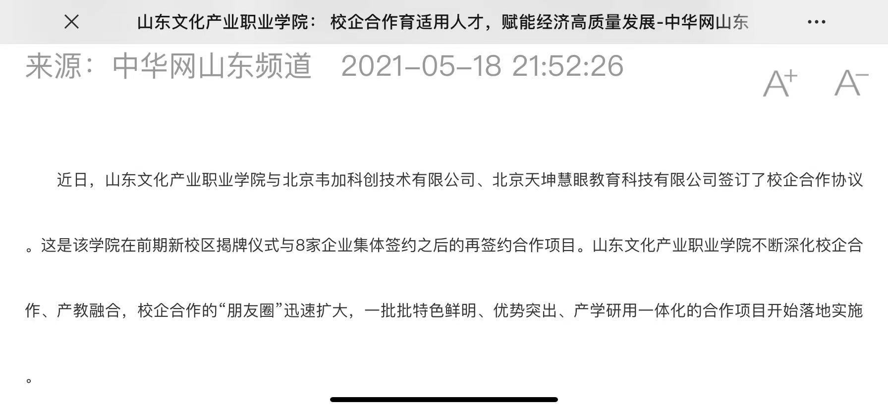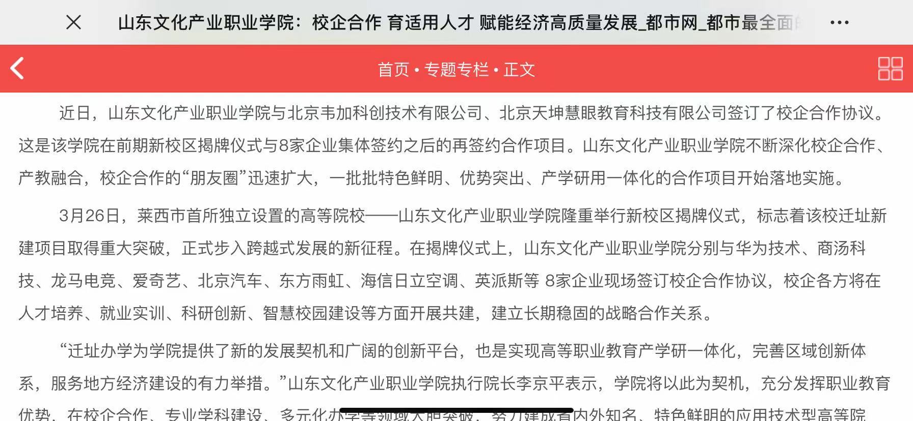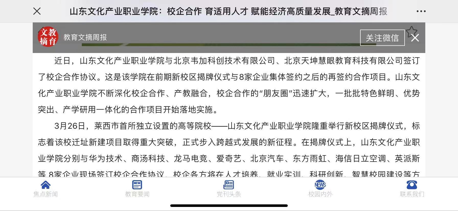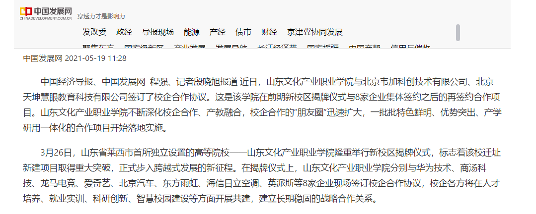 学院优质的教学资源,一流的“双师”队伍,优美的工作生活环境,深受合作企业、行业的青睐。继华为技术、商汤科技等8家企业集体签订校企合作协议之后,又与北京韦加科创技术有限公司、北京天坤慧眼教育科技有限公司、宁波菱创自动化有限公司签订了校企合作协议;京东物流、慧科教育科技集团有限公司、阿里巴巴(杭州)创新中心、上海卡通尼文化发展有限公司、山东北斗教育研究院等与学院达成了广泛的合作意向,校企合作的“朋友圈”持续扩大,为培养高素质技术技能人才,更好地服务经济社会高质量发展奠定了坚实基础。