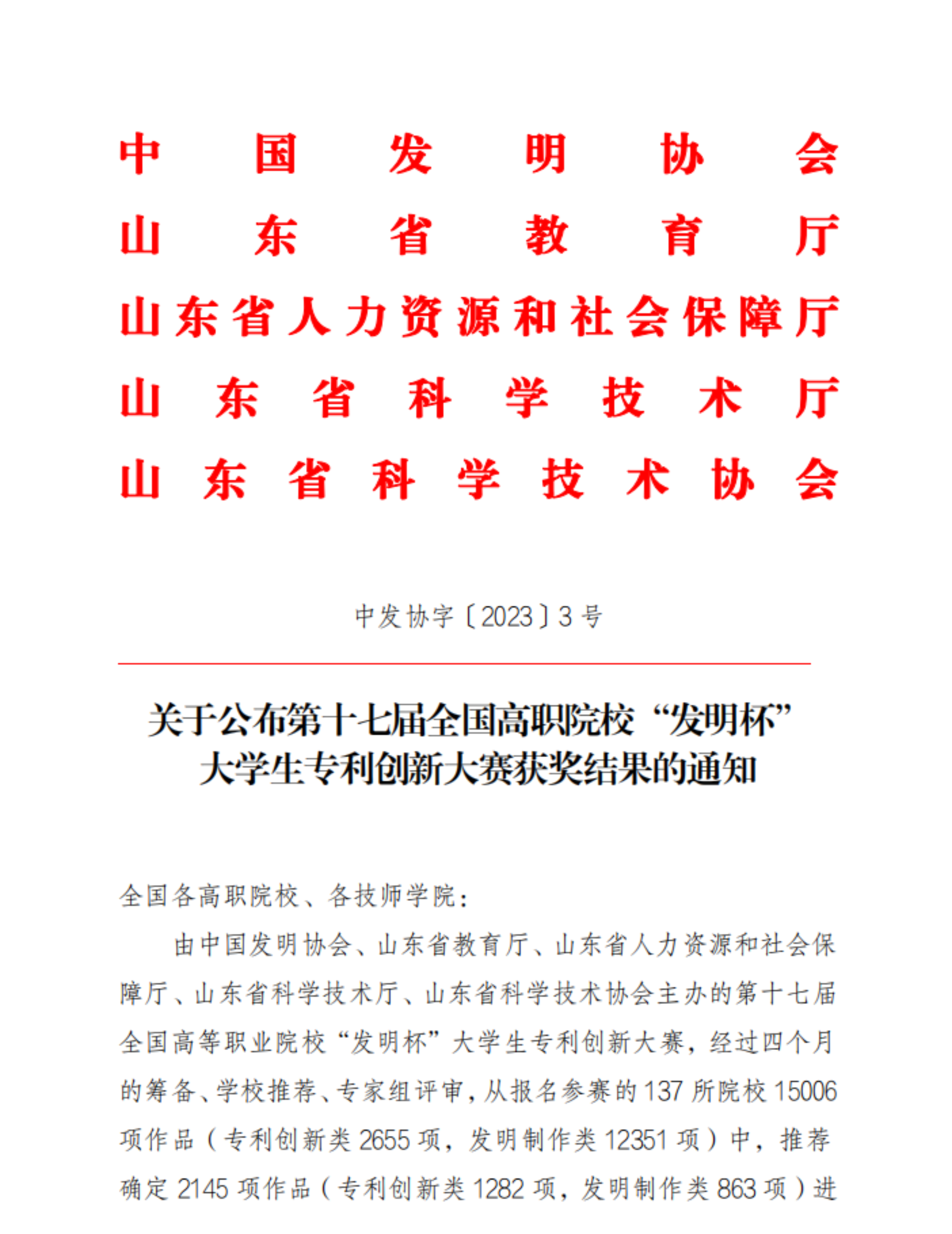 第十七届全国高职院校“发明杯”大学生专利创新大赛是由中国发明协会、山东省教育厅、山东省人力资源和社会保障厅、山东省科学技术厅、山东省市场监督管理局(山东省知识产权局)、山东省科学技术协会主办,大赛以“知识产权推动创新科学技术推进文明”为主题,旨在培养在校大学生的科技创新意识和实践动手能力,激发学生发明创造兴趣,为大学生营造大胆创新、勇于实践的良好氛围。