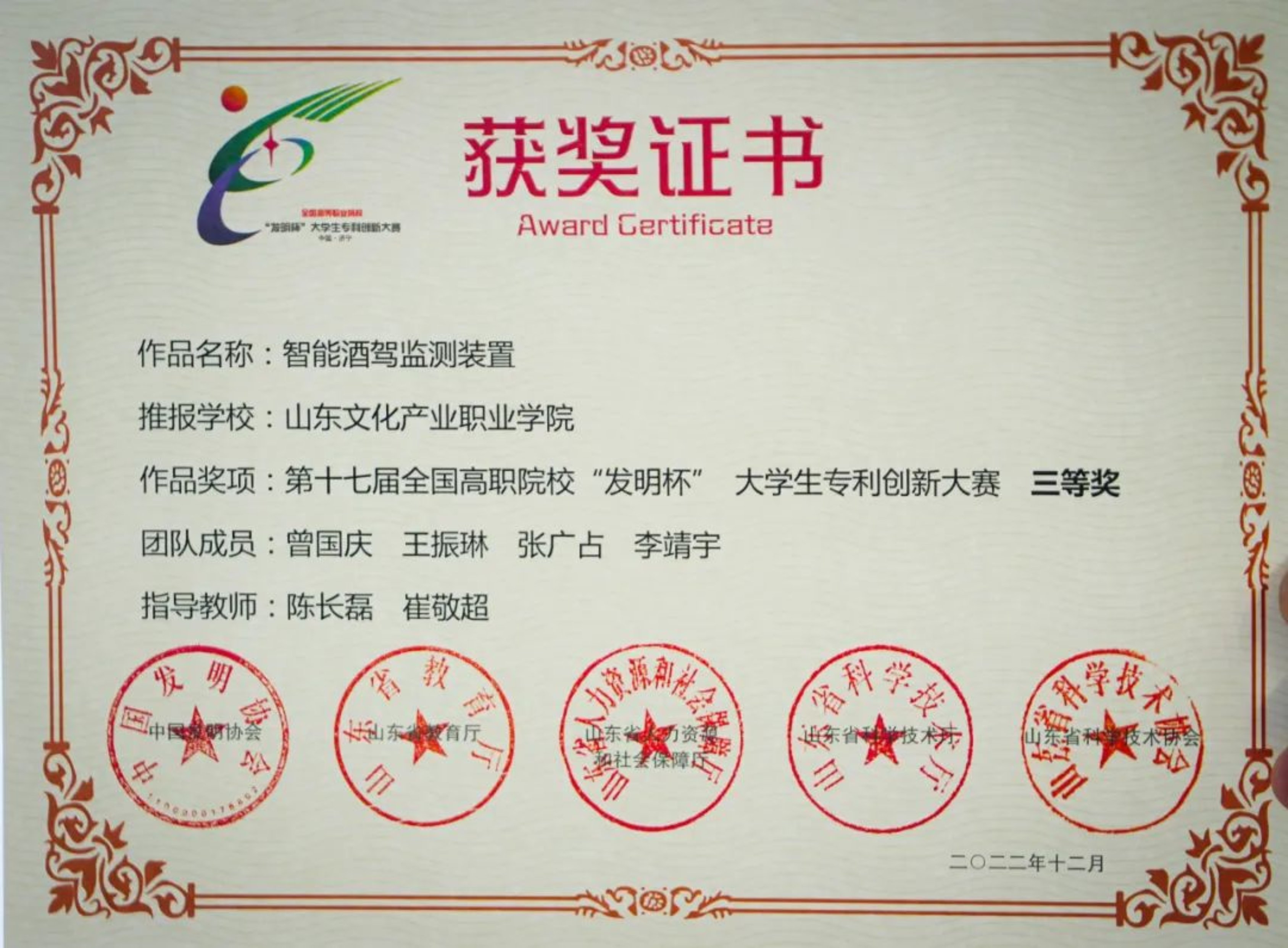 近日,由中国发明协会联合山东省教育厅、人社厅、科技厅主办的第十七届全国高职院校“发明杯”大学生专利创新大赛结果揭晓。必威betway西汉姆智能科技学院4名参赛学生的作品《智能酒驾监测装置》荣获国家三等奖。