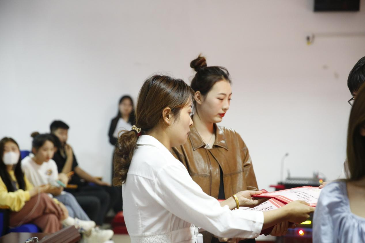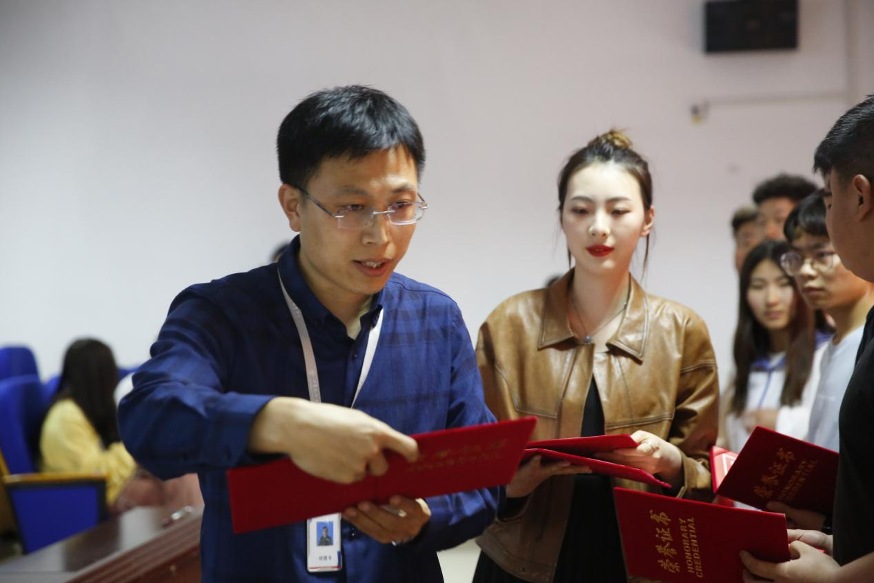 表彰大会现场,由院长助理刘建冬、校团委科长冯康为志愿者们颁发证书。