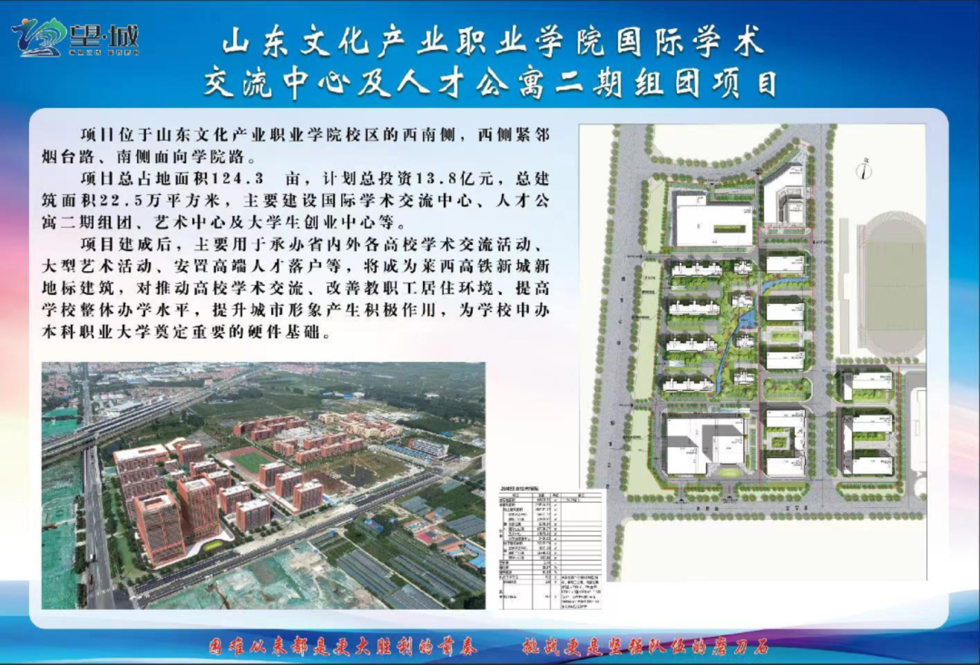 国际学术交流中心及人才公寓二期组团项目总占地面积124.3 亩,计划总投资13.8亿元,总建筑面积22.5万平方米,主要建设国际学术交流中心、人才公寓二期组团、艺术中心及大学生创业中心等。项目建成后,主要用于承办省内外各高校学术交流活动、大型艺术活动、安置高端人才落户等,将成为莱西高铁新城新地标建筑,对推动高校学术交流、改善教职工居住环境、提高学校整体办学水平,提升城市形象产生积极作用,为学校申办本科职业大学奠定重要的硬件基础。