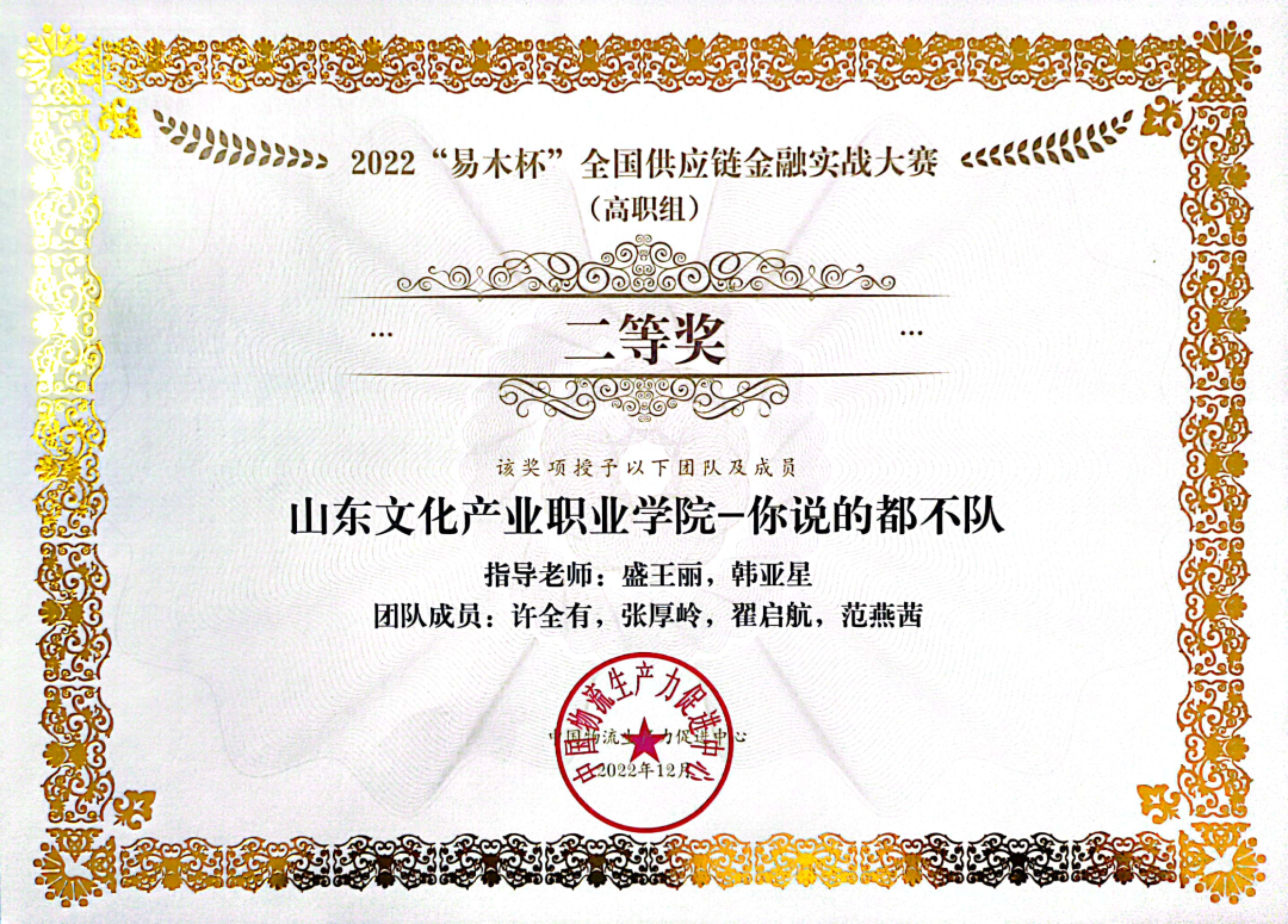 必威betway西汉姆轨道交通学院学生许全有、范燕茜、张厚龄、翟启航四名同学在韩亚星老师和盛王丽老师的联合指导下,经过2个月的努力拼搏,在406支队伍中脱颖而出,荣获由中国物流生产力促进中心主办的2022“易木杯”全国供应链金融实战大赛(高职组)全国二等奖。