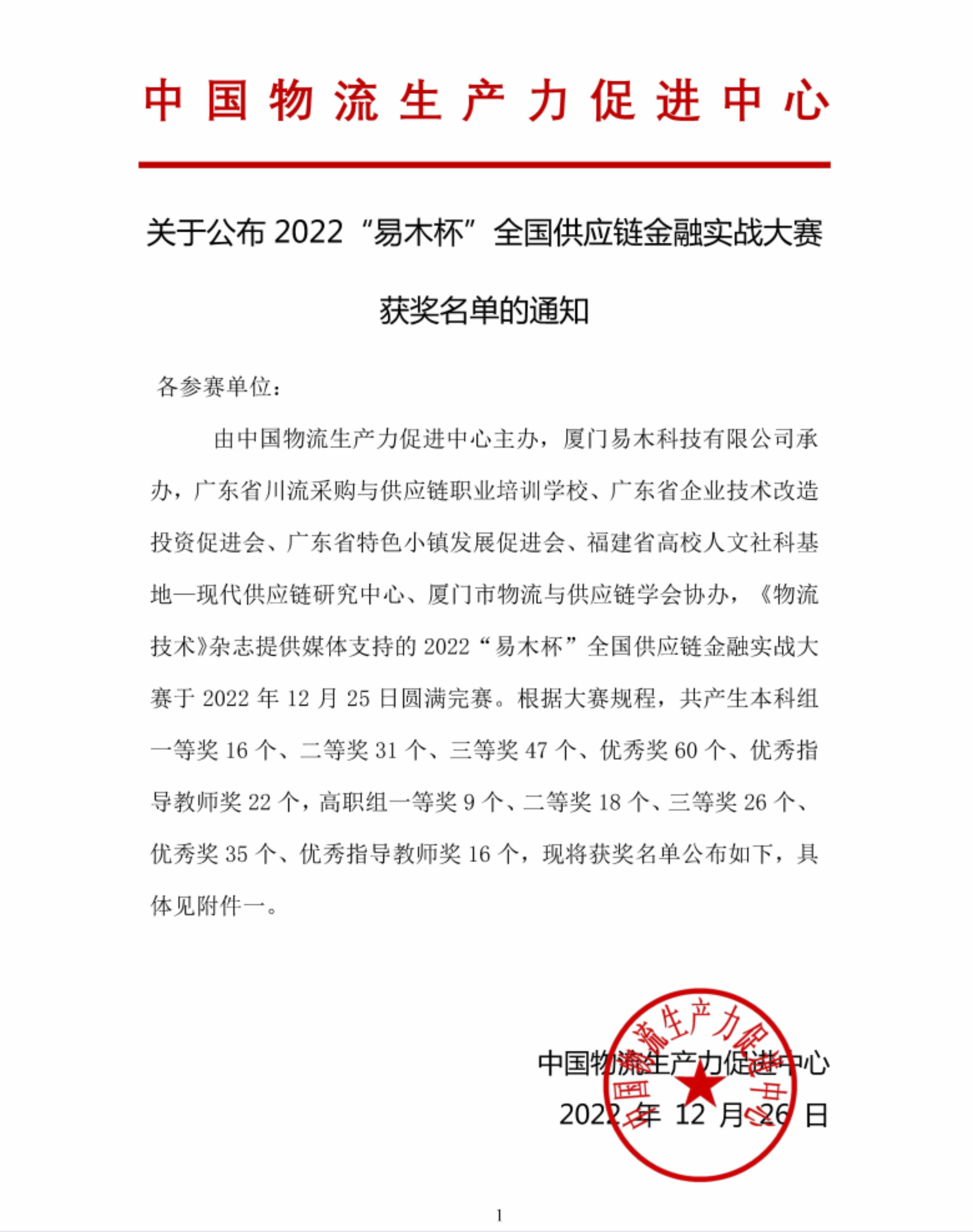 2022年12月25日,由中国物流生产力促进中心主办,厦门易木科技有限公司承办的2022“易木杯”全国供应链金融实战大赛成功落下帷幕。必威betway西汉姆轨道交通学院参赛队的4名参赛队员刻苦备赛、沉着参赛、稳定发挥,荣获高职组全国二等奖的优秀成绩。