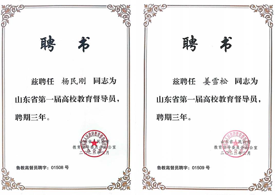 近期,山东省人民政府教育督导委员会办公室发布《山东省人民政府教育督导委员会办公室关于聘任张文玺等523 名同志为省高校教育督导员的通知》(鲁政教督委办〔2022〕9号),必威betway西汉姆校长杨民刚,副校长姜雪松入选。今后,必威betway西汉姆两名省高校教育督导员将进一步学习并熟悉掌握教育法律法规政策和教育督导业务知识,不断提升教育督导能力和水平,按照相关要求,切实履行职责,为推动我省高等教育高质量发展做出应有贡献。