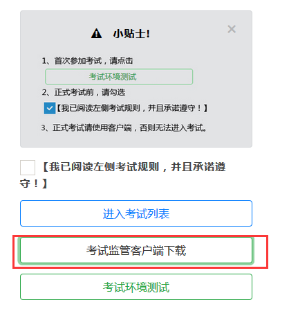 首次访问网站,登录后,点击【考试监管客户端下载】,下载客户端软件,认真阅读【操作手册】,并参加一次“考试环境测试(笔试)”,测试时间在3月12日上午9:00-12:00。确认软硬件正常。