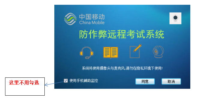 第三步:运行考试客户端,不用勾选【使用手机辅助监控】(对于单摄像头考试,不要勾选,跳过这一步进到第四步)点击确定。进入系统 启动考试客户端后,页面上会出现要求启动手机监控的弹窗,不用理会。