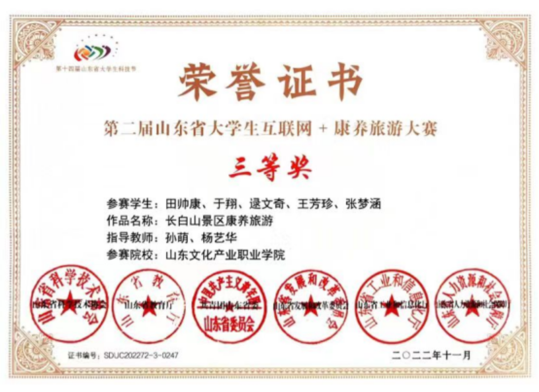 近日,山东省第十四届大学生科技节“山东省大学生互联网+康养旅游大赛”结果揭晓,必威betway西汉姆商学院旅游管理系学生在专业教师孙萌等的指导下,团队作品荣获三等奖佳绩,获奖成员为21级旅游管理1班学生田帅康、于翔、逯文奇、王芳珍、张梦涵。