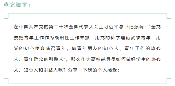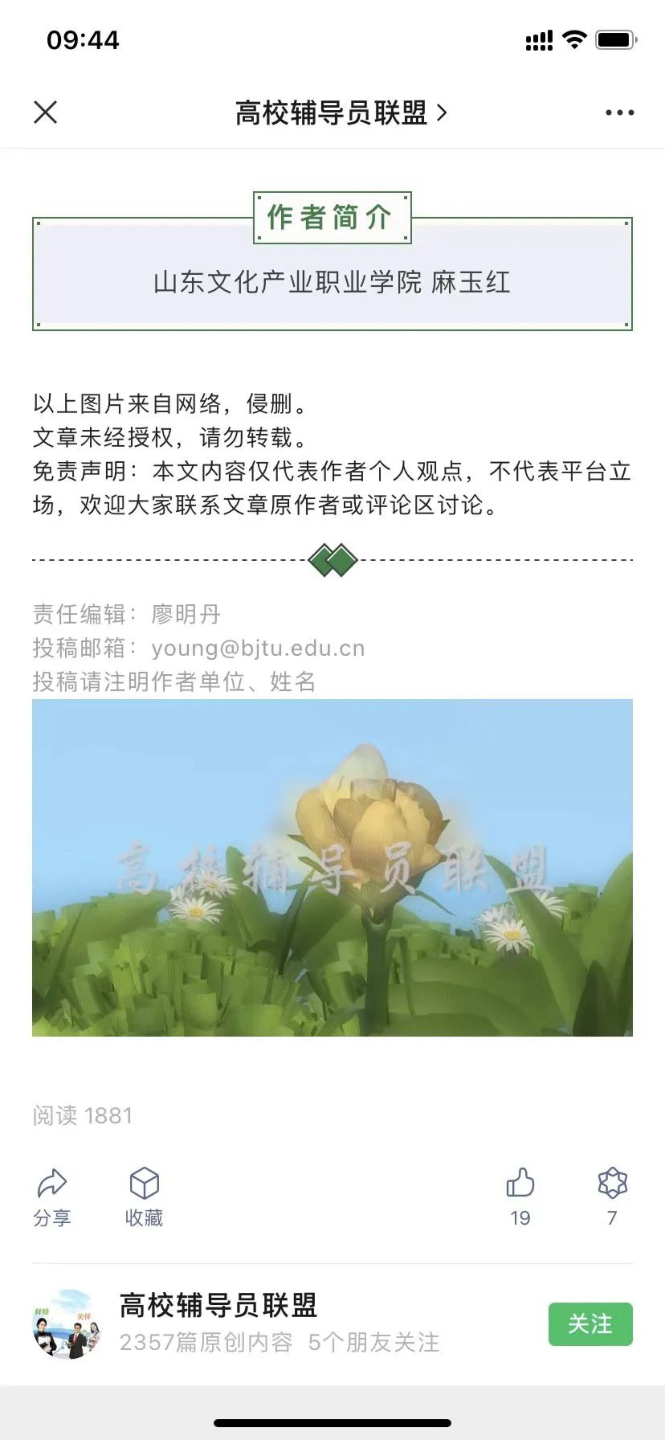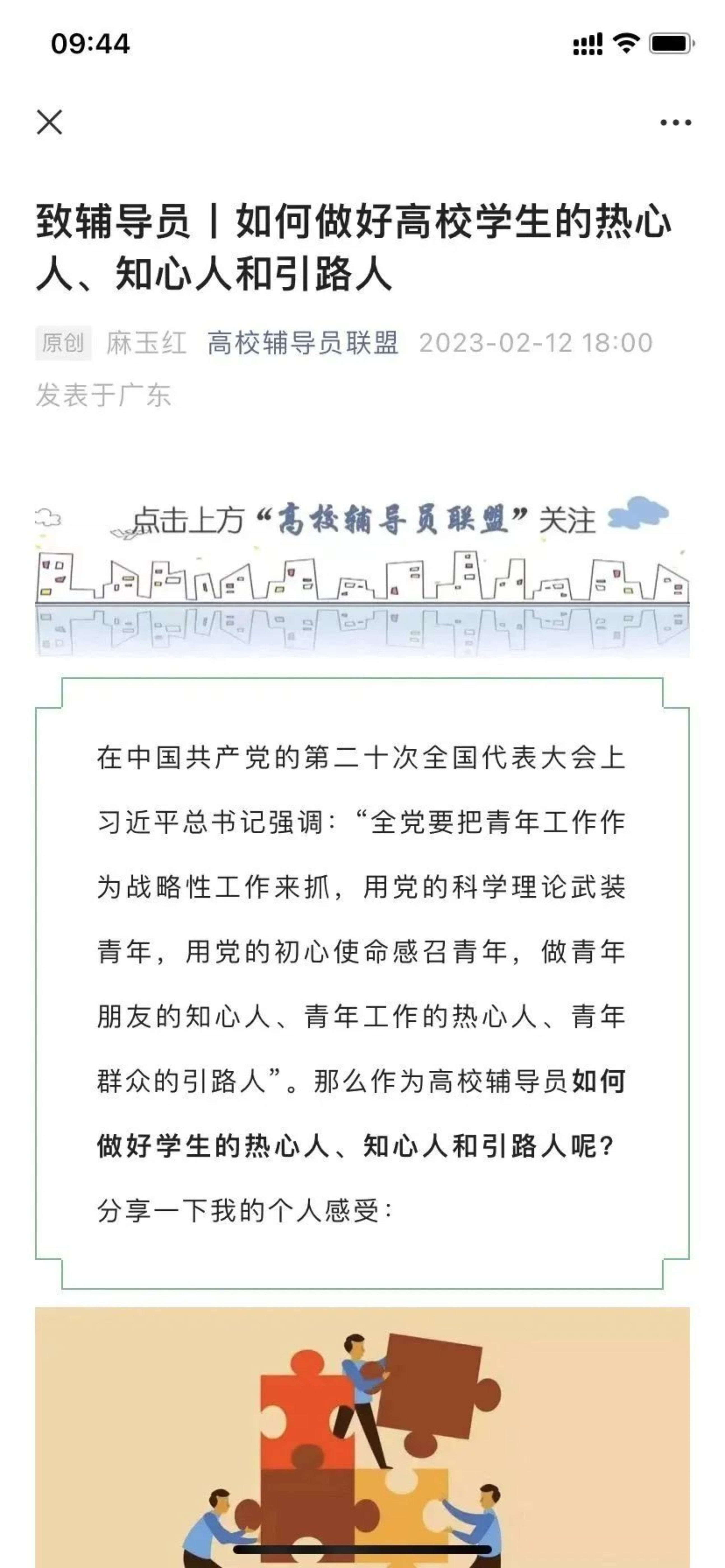 2023年2月12日,高校辅导员联盟微信公众号刊发必威betway西汉姆艺术学院辅导员麻玉红老师题为《致辅导员丨如何做好高校学生的热心人、知心人和引路人》的投稿文章。文章以党的二十大精神为指引,贯彻落实习近平总书记关于青年工作的重要思想,通过分析日常学生管理工作案例,就如何做好学生的热心人、知心人和引路人提出了解决思路,充分展现必威betway西汉姆辅导员队伍建设的职业化、专业化及专家化。
