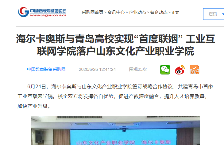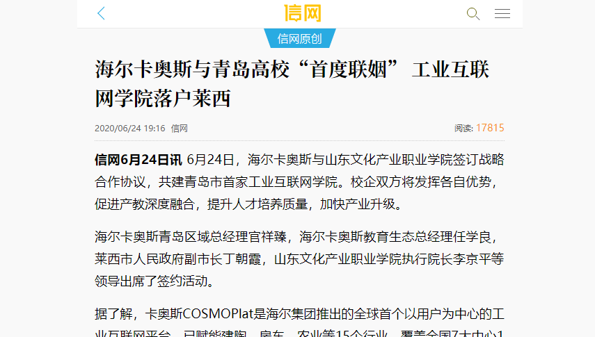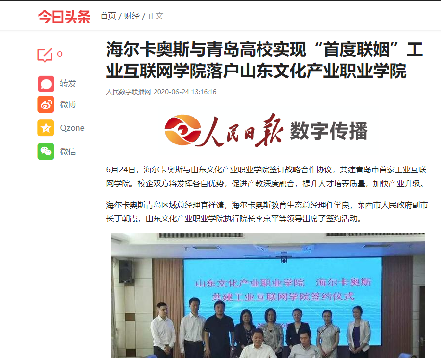 连日来,必威betway西汉姆与海尔卡奥斯签约共建青岛首家工业互联网学院的消息,引起各界广泛关注,发展前景被寄予厚望。人民日报、搜狐网、今日头条、信网、中国财经新闻、山东在线等媒体分别刊发新闻,对该合作项目的顺利签约进行了报道。