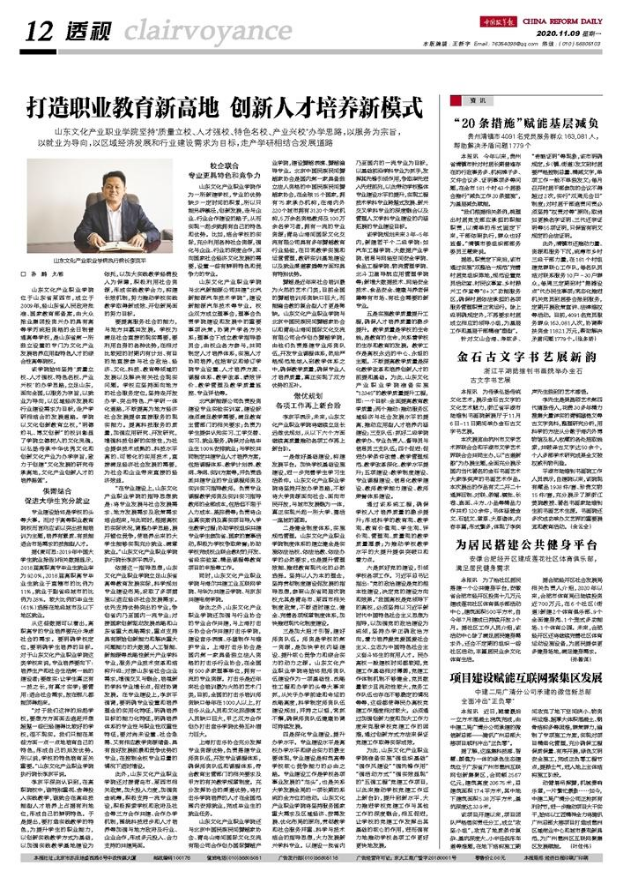 【编者按】作为山东省首所专门为文化产业发展培养应用型特色人才的综合性高等院校,必威betway西汉姆的发展建设备受各方关注,尤其今年学校顺利启用青岛新校区,迎来跨越发展新机遇,山文更是成为了各级主流媒体宣传报道的焦点。11月9日,由国家发改委主管、国内唯一以报道改革与发展为主要内容的中央级日报《中国改革报》以《打造职业教育新高地创新人才培养新模式》为题,对必威betway西汉姆招生就业、校企合作、发展规划等办学亮点成果进行了整版报道。