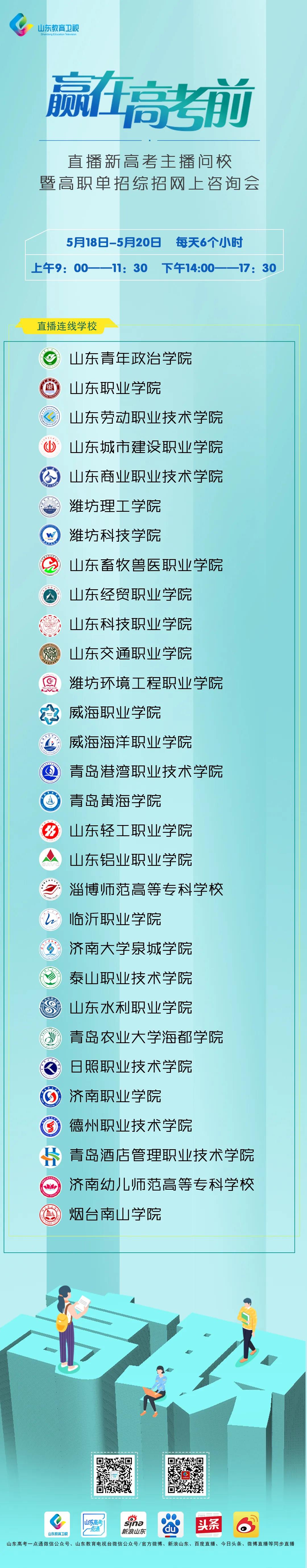 本次直播活动将于5月18日—20日正式展开,山东教育卫视将派出8路记者,实地走访我省高职院校。直播节目采取“演播室+外景现场连线”的形式,通过采访各高职院校招生负责人、学科带头人、合作企业负责人等,向考生和家长全面介绍我省高职院校2020年单招综招政策以及学校特色与亮点,帮助考生和家长了解高校、了解专业、做好准备、充分应对。
