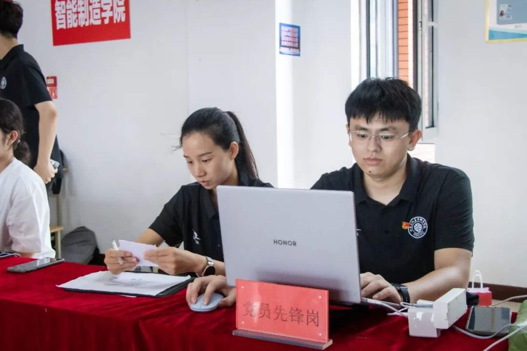 除了学生志愿者,各学院的党员志愿者们也出动了。学校各级党组织积极响应号召,设立“党员先锋岗”,党员教职工与学生党员统一佩戴党徽,亮明身份、主动靠前。他们分散在校园入口、报到大厅、宿舍楼下等关键点位,耐心为新生解答报到流程、专业学习、校园生活等疑问,主动帮助新生搬运行李、指引路线,用热情的态度和细致的服务化解新生初入校园的陌生感与不适感。