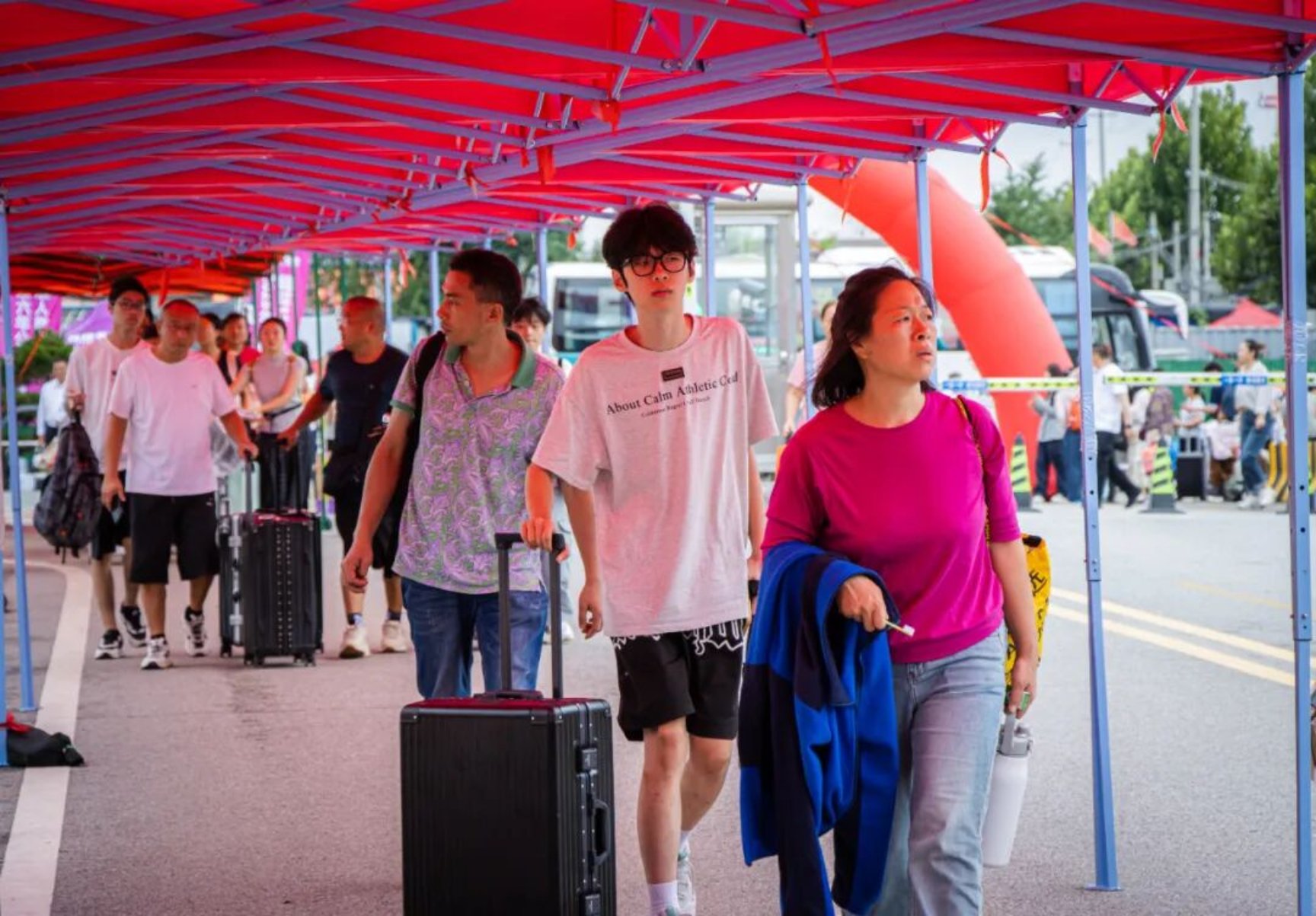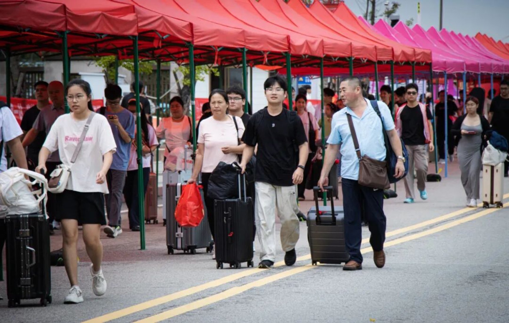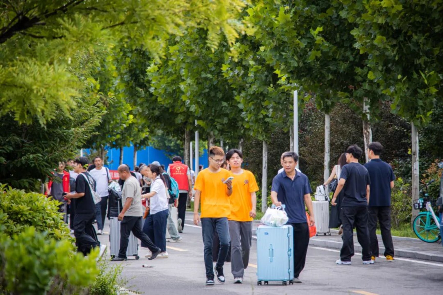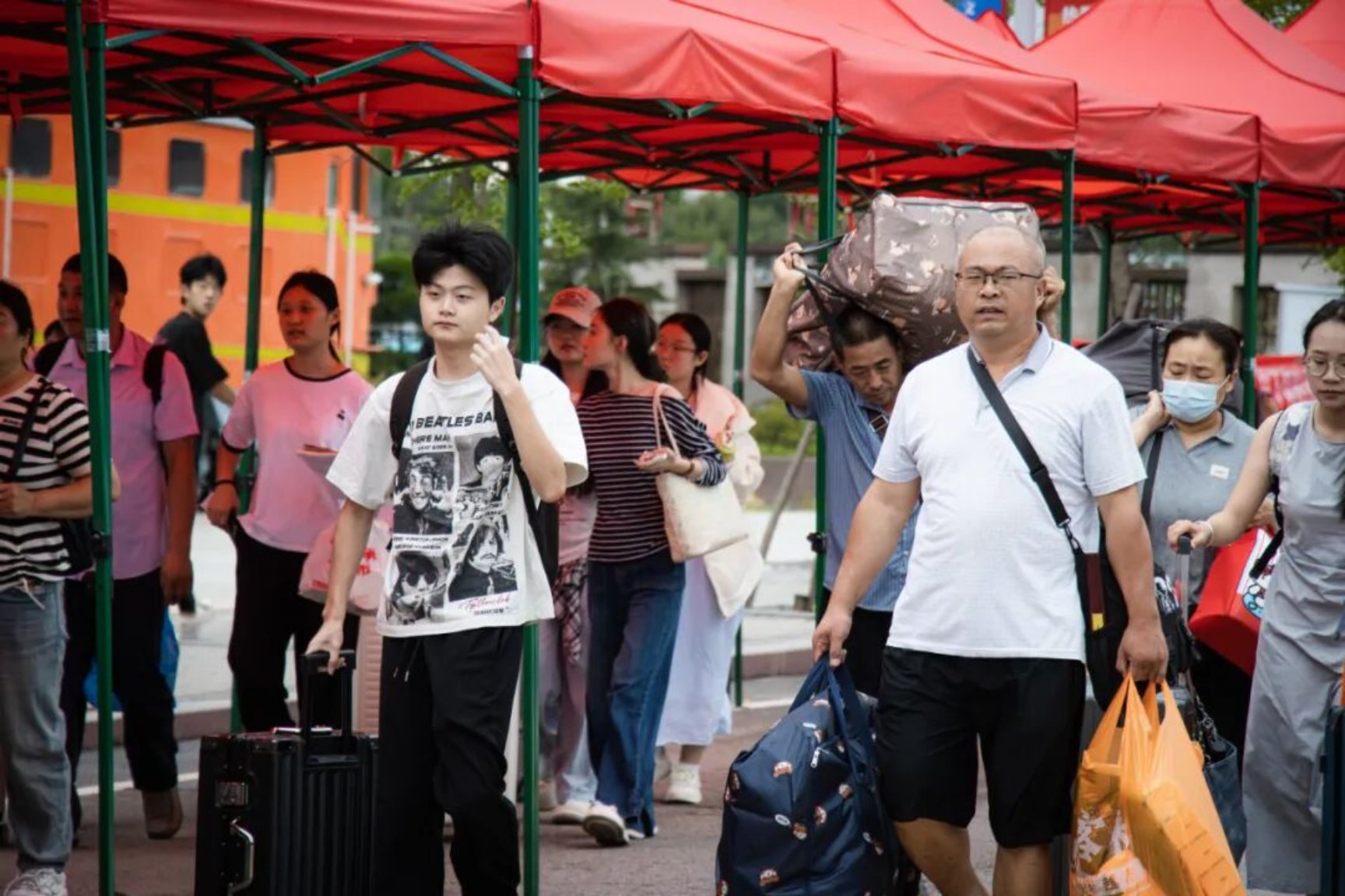 迎新现场最动人的,还有陪伴新生入学的爸爸妈妈们。他们拉着大包小包的行李,一路嘱托,喜悦、嘱托、离别时偷偷抹泪又赶紧擦干,说:“你好好学,我们回去了。”