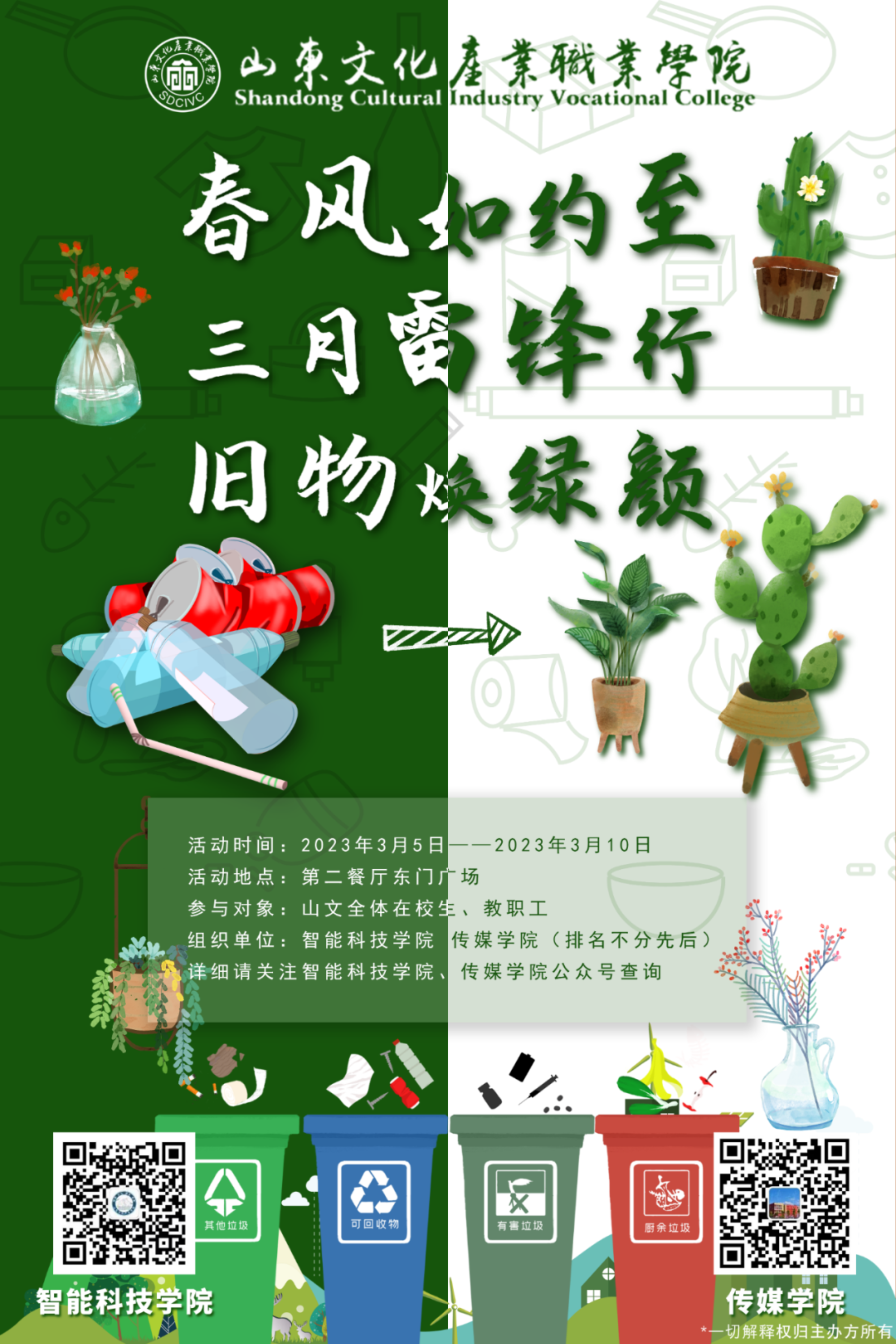 正值春日雷锋月,智能科技学院携手传媒学院共同打造,面向山文全体学子的“春风如约至 三月雷锋行 旧物焕绿颜”活动。本次活动将同学们平日里未曾注意到的废旧纸板,塑料水瓶,兑换成一株株青色荡漾的多肉植物,增添平日生活中的一抹绿。