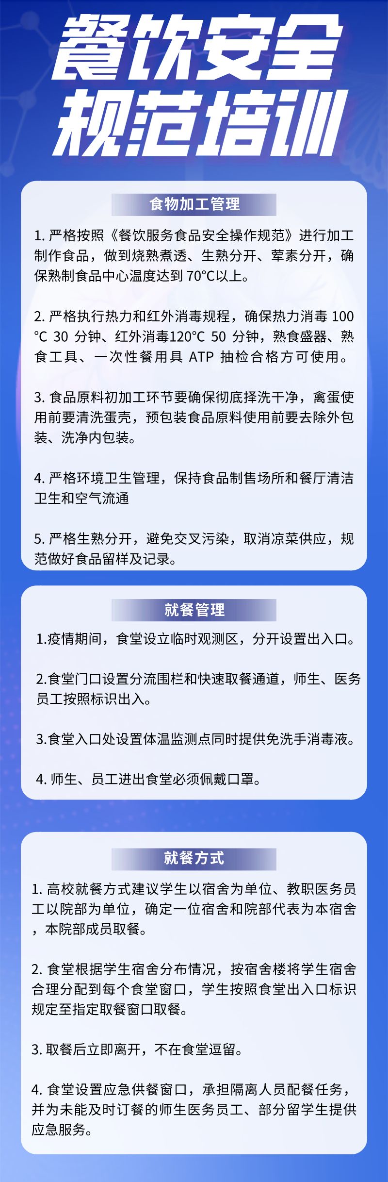 严格餐饮管理,建设食安校园,各地、各校要按照属地管理原则,在当地卫生健康、疾控、市场监管等部门指导下,严格落实新冠肺炎食堂卫生防疫要求,严格落实学校食品安全教育行政部门主管责任、学校主体责任和校(园)长第一责任人责任,强化食堂管理,保障我们广大师生的生命安全和身体健康。