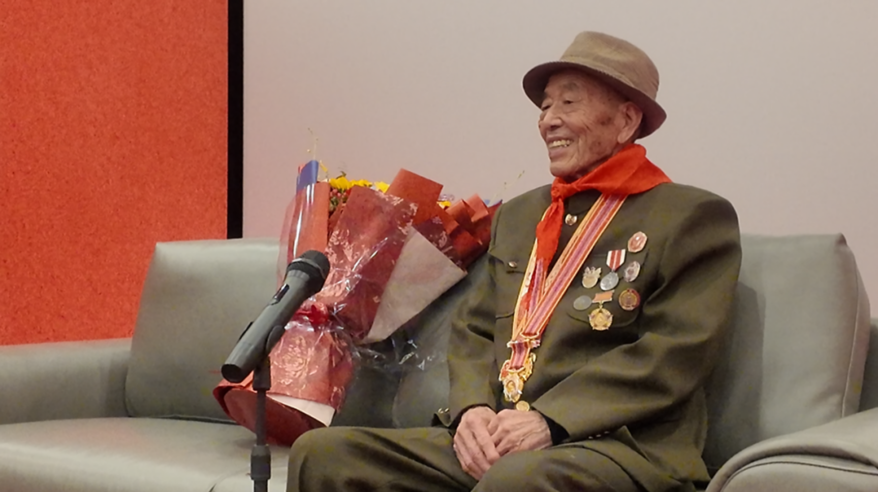 大屏幕播放了张玉明老人的个人履历,让师生们更清晰地了解他的英雄过往。大、中、小学三名学生代表上台,向老人献花敬礼。苏州路小学的学生代表还为张玉明爷爷系上鲜艳的红领巾,这不仅是敬意的象征,更寓意着革命精神的代代传承。