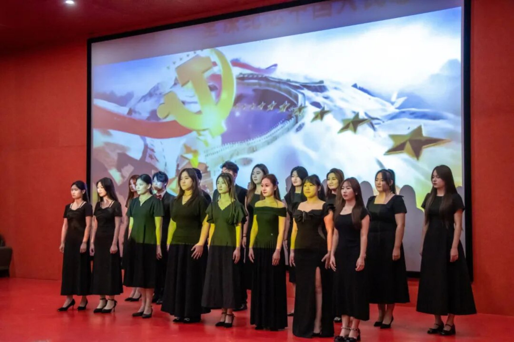 在场人员全体起立齐唱《中华人民共和国国歌》,嘹亮的歌声中饱含对祖国的赤诚与敬意。