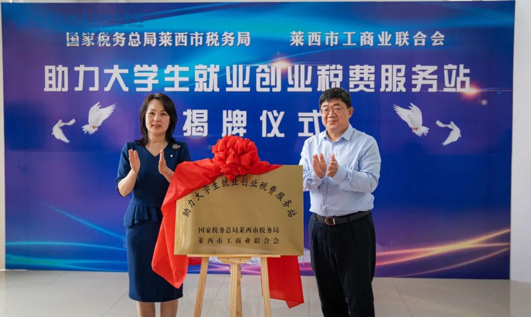 活动伊始,何倩、李同舜共同为“助力大学生就业创业税费服务站”揭牌,开创了“税校互促”合作新模式,开启了税收助力就业创业新篇章。