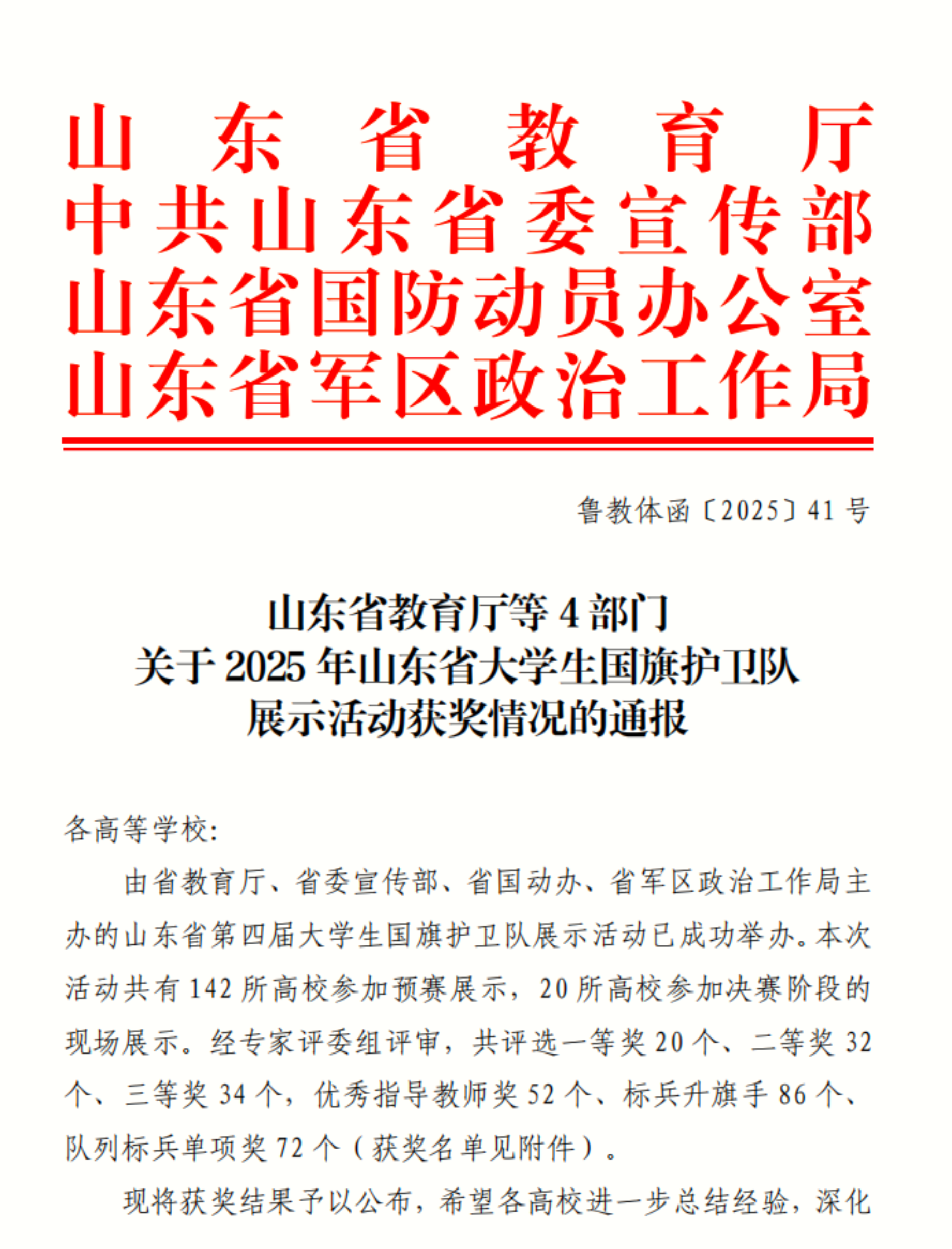 近日,由山东省教育厅、中共山东省委宣传部、山东省国防动员办公室、山东省军区政治工作局联合主办的2025年山东省大学生国旗护卫队展示活动公布获奖名单。betway西汉姆联官方网站国旗护卫队凭借出色表现和昂扬风貌,在全省高校中脱颖而出,荣获团体二等奖。王晓群老师获评“优秀指导教师”,王传灿、王皓同学分别荣获“标兵升旗手”“队列标兵”称号。