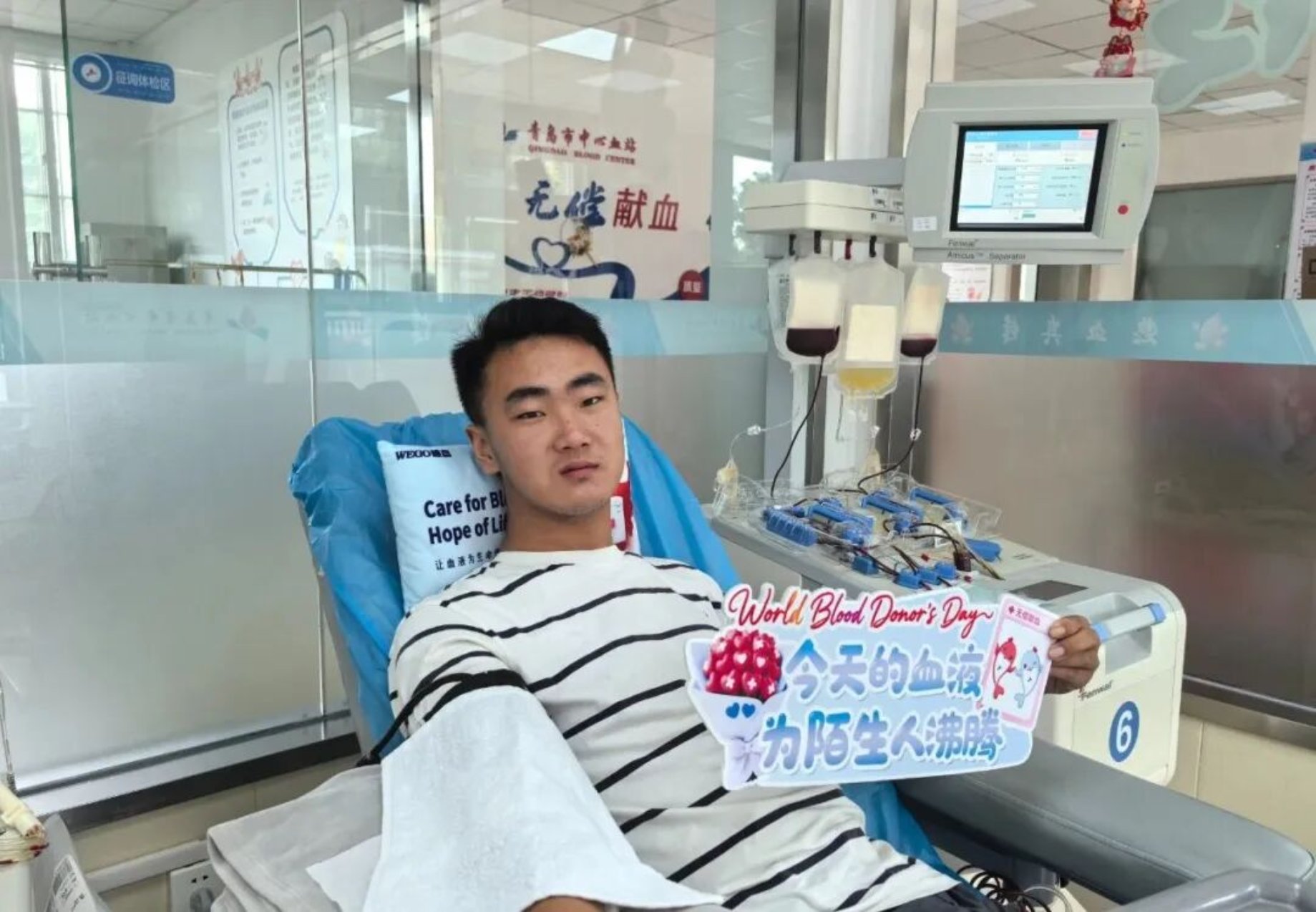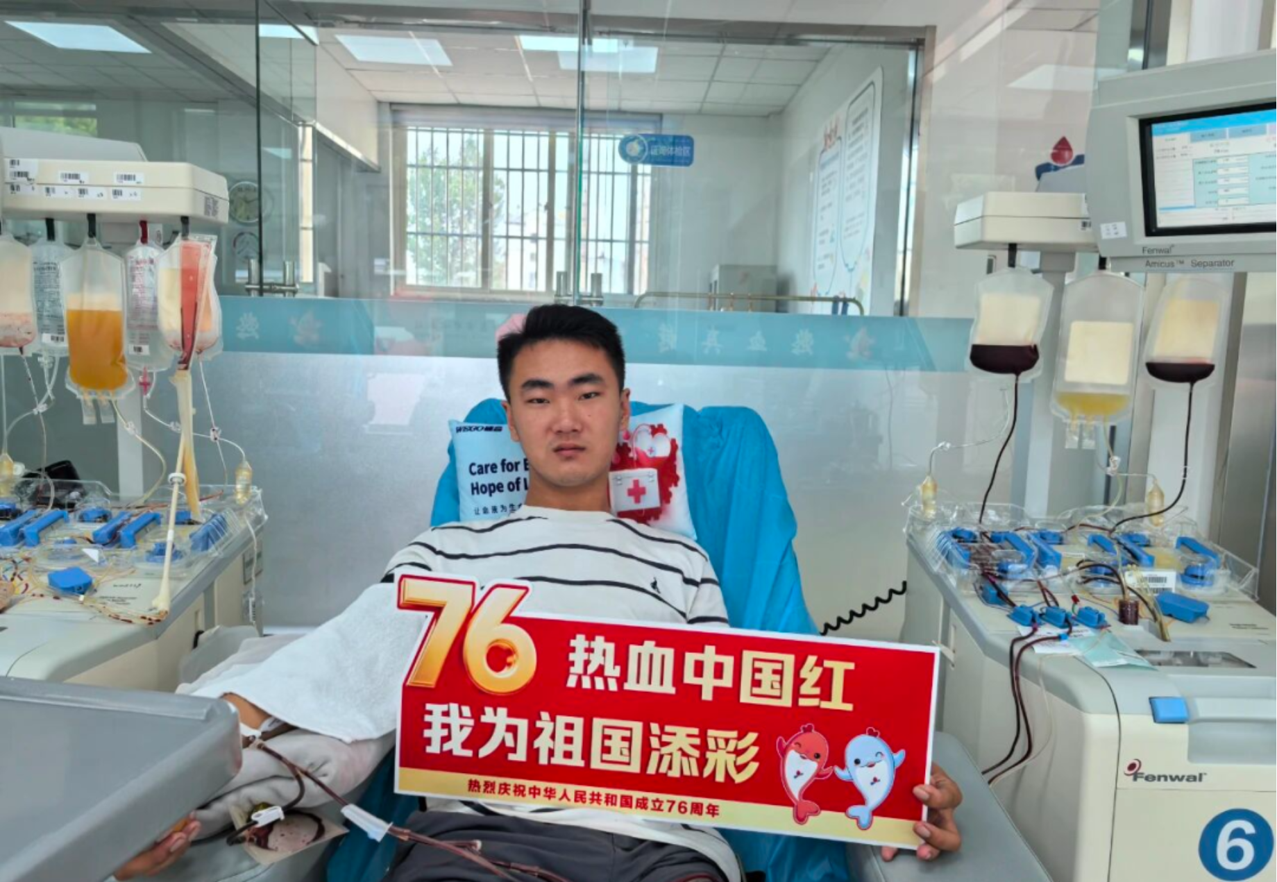 国庆中秋假期期间,在莱西献血服务部机采室,来自学校智能制造学院2023级电气自动化技术专业的董梓豪,再次成功捐献了2个治疗量的机采血小板。