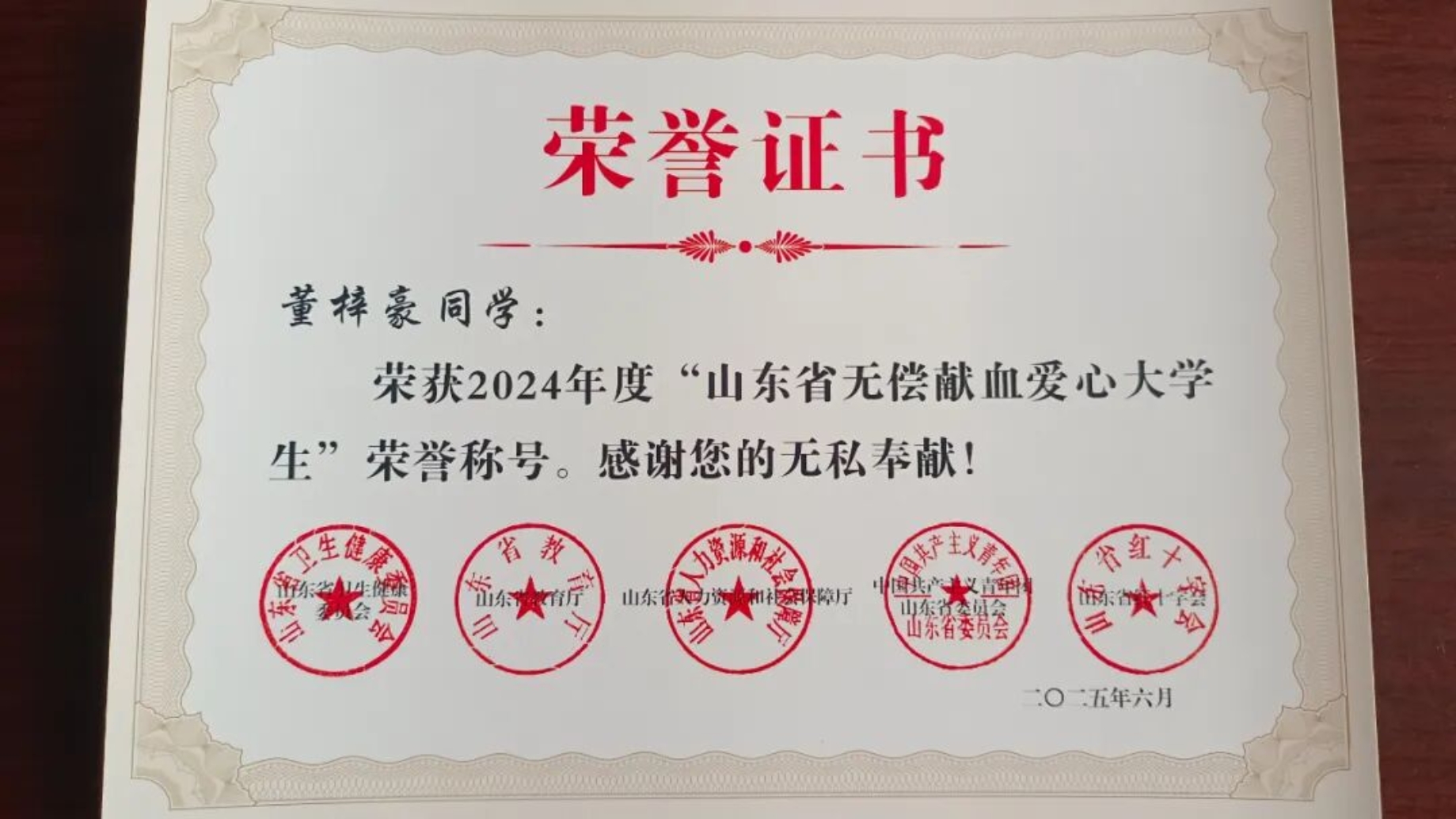 富有爱心的董梓豪,在2023和2024年度连续两次荣获“山东省无偿献血爱心大学生”荣誉称号,成为学校中的优秀代表。