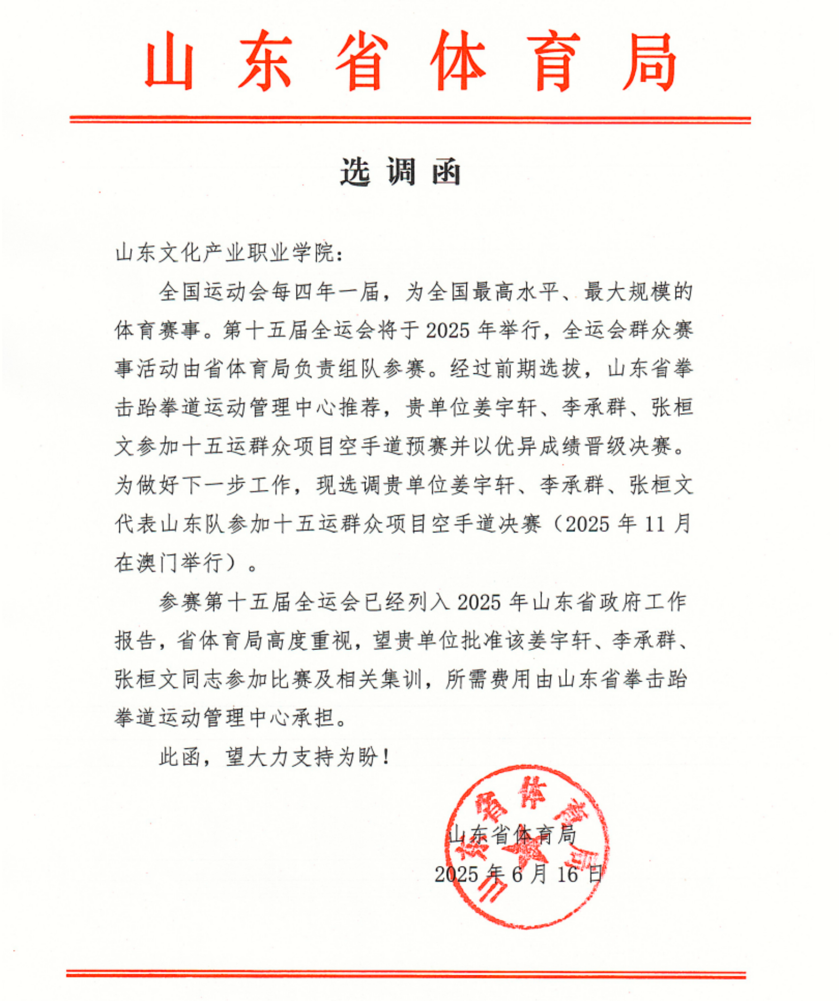 2025年6月,山东省体育局向betway西汉姆联官方网站发来选调函,姜宇轩、李承群、张桓文3名学子经前期严格选拔、由山东省拳击跆拳道运动管理中心推荐,成功入选山东省第十五届全运会群众项目空手道队,肩负起代表山东征战全运会决赛的重任。