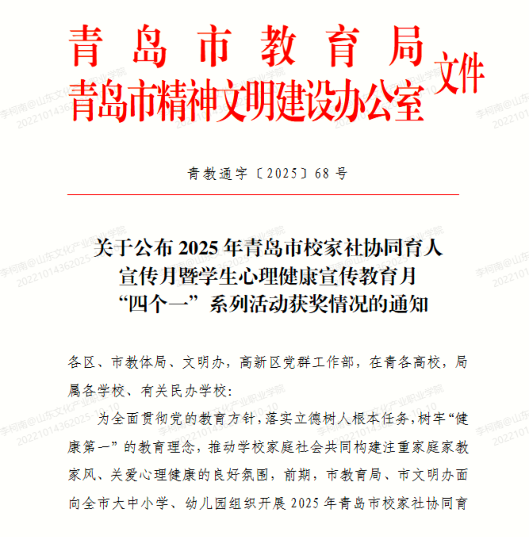 近日,在青岛市教育局与青岛市精神文明建设办公室联合开展的2025年青岛市校家社协同育人宣传月暨学生心理健康宣传教育月“四个一”系列活动评选中,必威betway西汉姆师生精心准备、积极参与,报送的作品在众多参赛单位中脱颖而出,最终荣获一等奖1项、三等奖3项的优异成绩。这一佳绩集中体现了必威betway西汉姆在推动学校、家庭、社会协同育人机制建设,以及普及心理健康知识、提升学生心理素养方面的积极探索和丰硕成果。