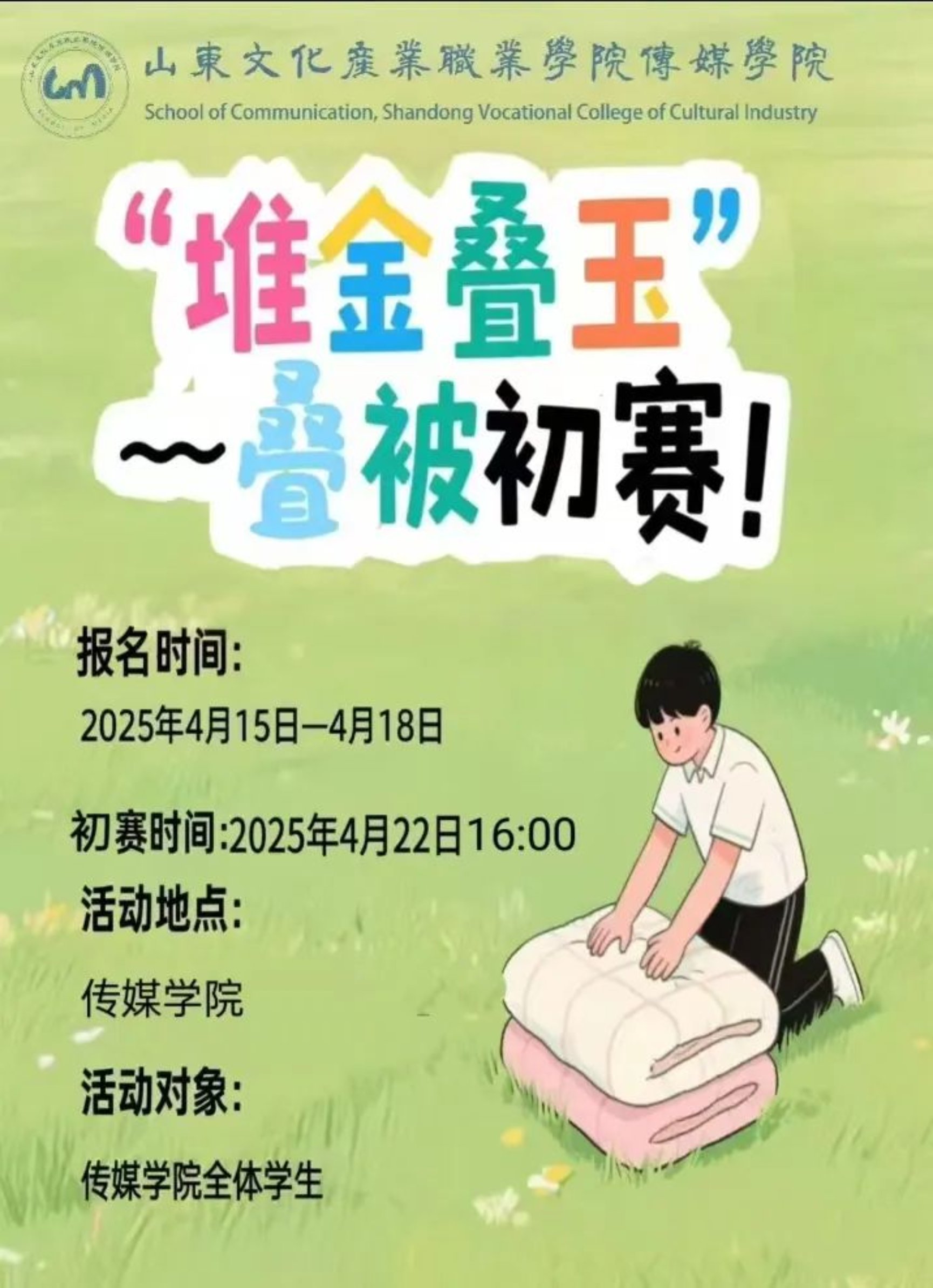 别再犹豫,快叫上身边的室友、同学,一起报名参加堆金叠玉叠被子大赛。用双手创造整洁,用行动诠释生活态度,在小小的一方床铺间,“叠”出大大的精彩! 期待大家在大赛中展现出非凡实力,共同见证“最美被子”的诞生!