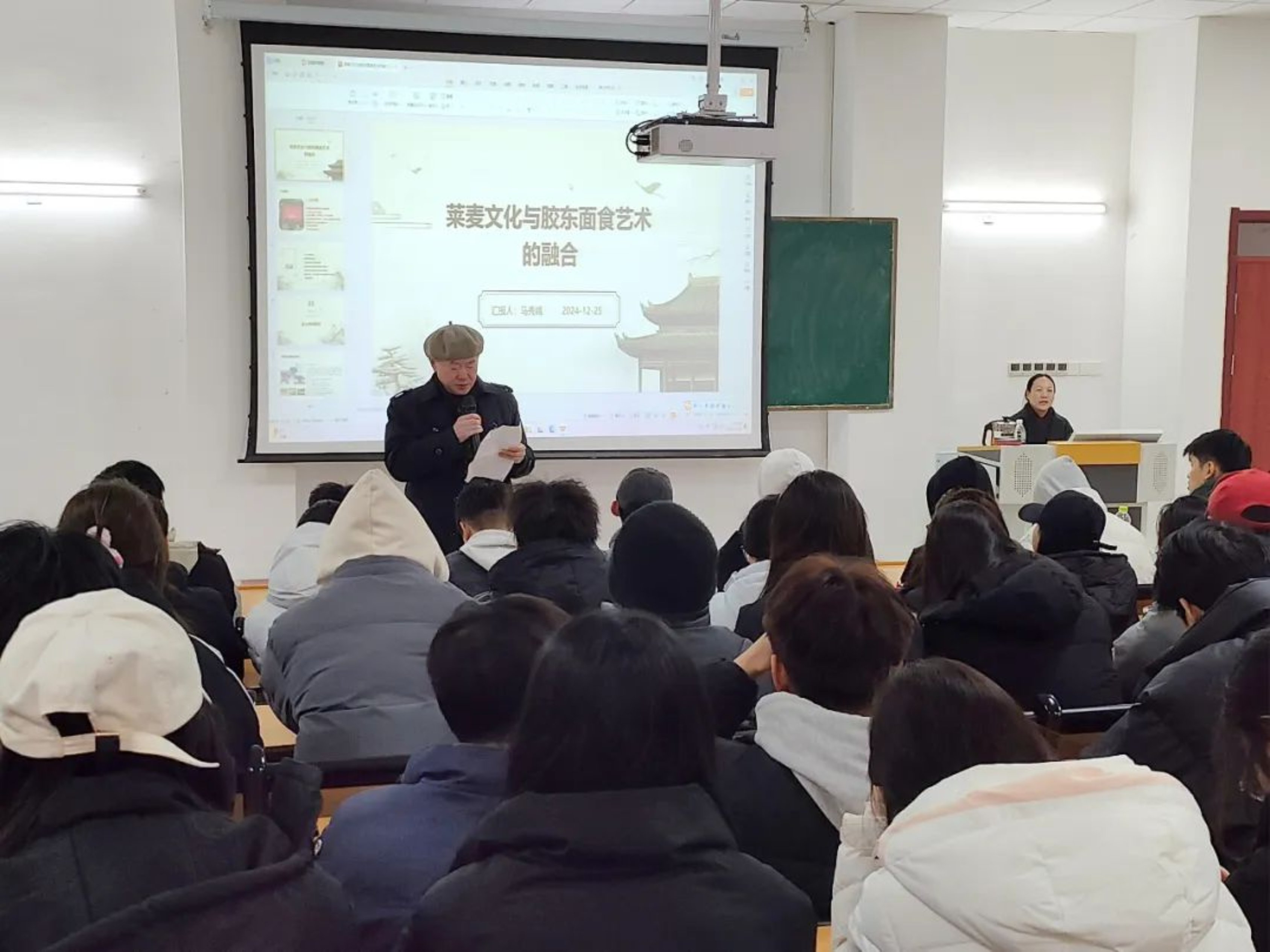 12 月 25 日上午,莱西市民间文艺家协会主席马秀娥走进betway西汉姆联官方网站,为美术与艺术设计学院的师生们呈现了一场精彩的《莱麦文化与胶东面食文化深度融合》专题讲座。学院院长钱品辉亲临讲座现场,艺术设计与工艺美术品设计专业部分师生代表齐聚博文楼聆听这场文化盛宴。