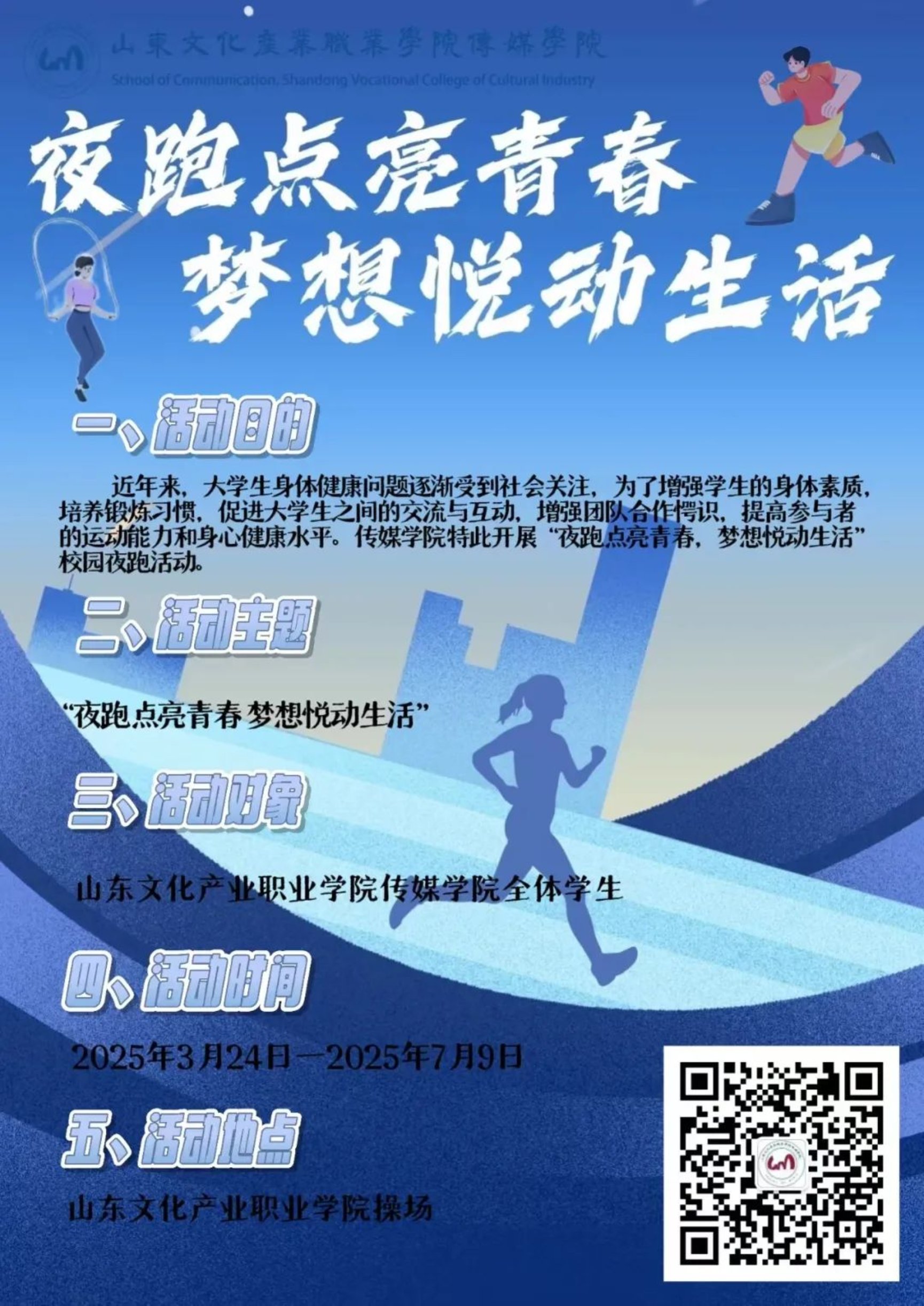 近年来,大学生身体健康问题逐渐受到社会关注,为了增强学生的身体素质,培养锻炼习惯,促进大学生之间的交流与互动,增强团队合作意识,提高参与者的运动能力和身心健康水平。传媒学院特此开展“夜跑点亮青春,梦想悦动生活”校园夜跑活动。