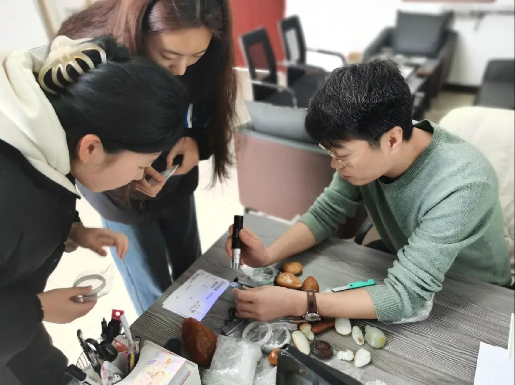文物修复与保护专业负责人鹿克虎老师为学生倾授珠宝玉石鉴定的相关知识,凭放大镜、紫外灯等简易工具,带学生捕捉染色石英岩的 “荧光蛛网”、识破酸洗注胶B货翡翠等。